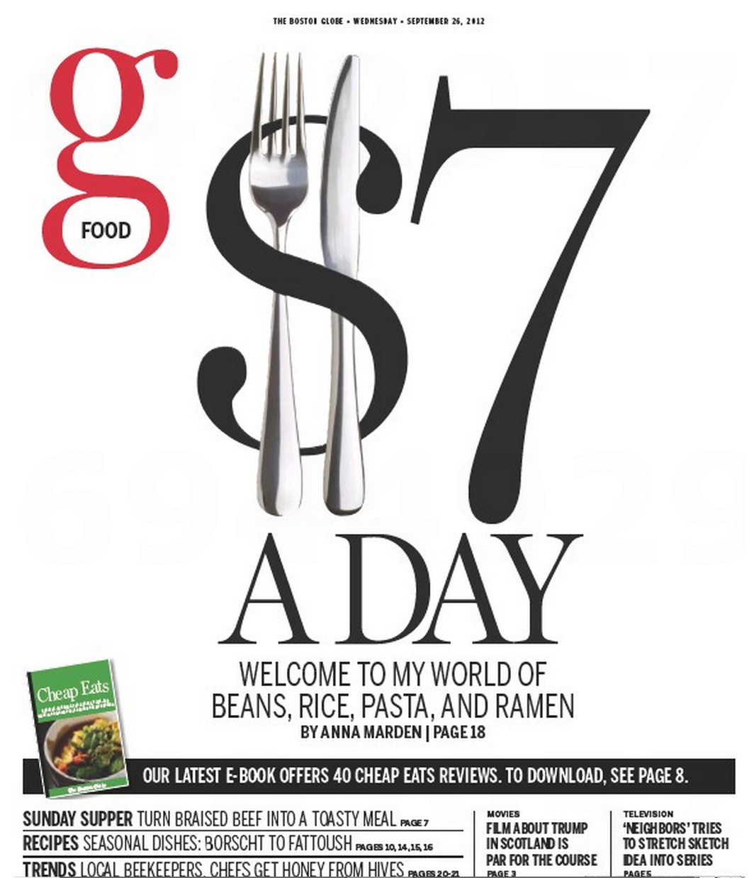 This story was published on the cover of the G section of The Boston Globe on Sept. 25, 2012. Its a personal story of how I lived on a very tight budget in the month following my college graduation.